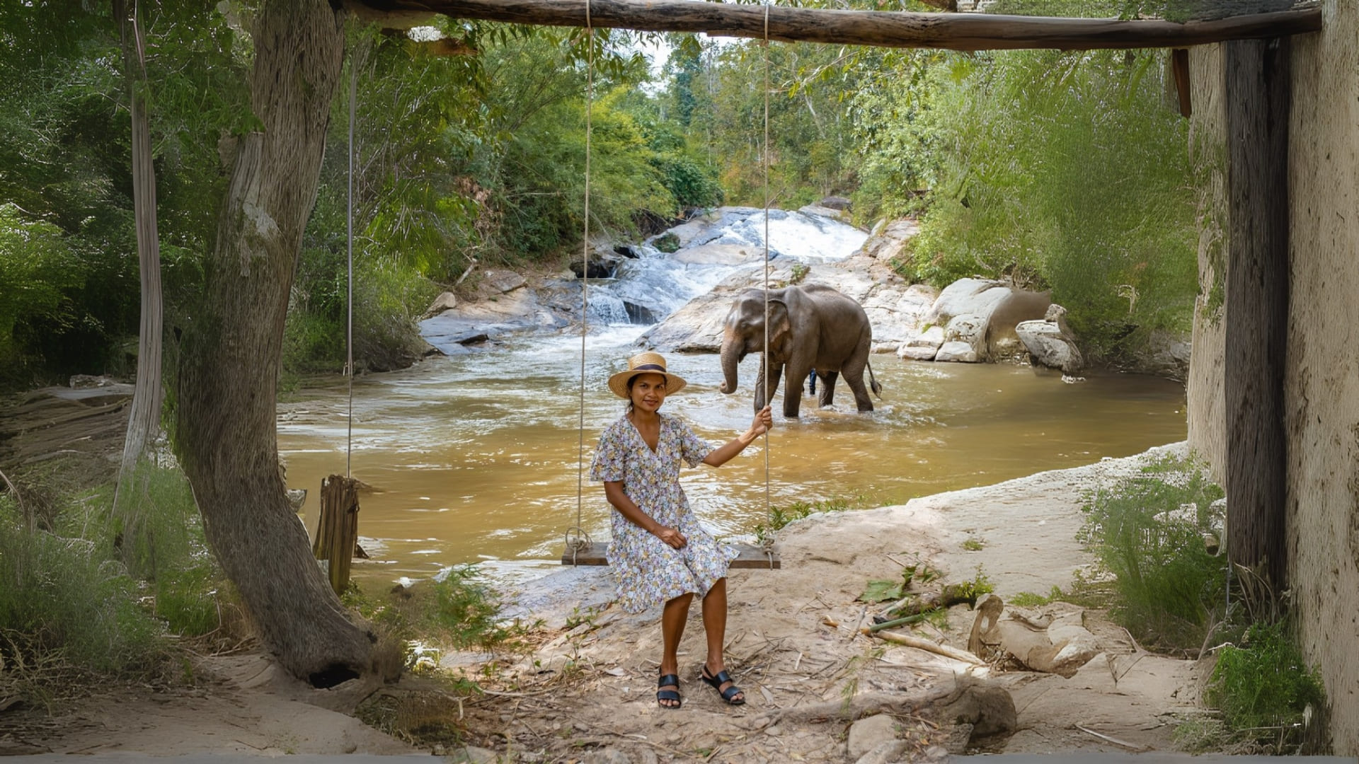 Woman on swing by river with elephant at Chiang Mai sanctuary.